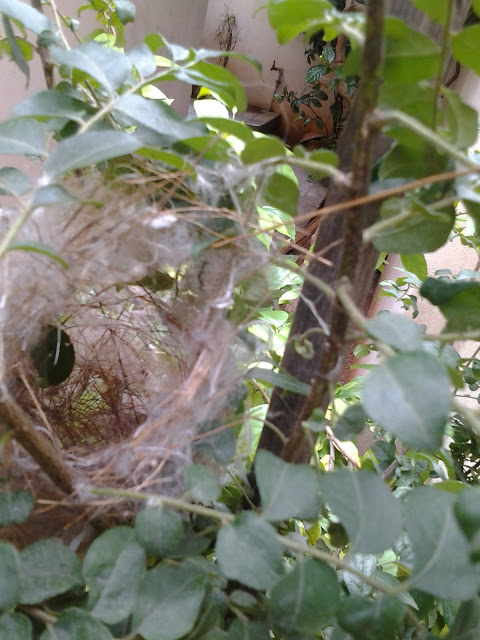 అవి పనిచేసే విధానాన్ని, వేగాన్ని, నైపుణ్యాన్ని, చూసి మనం ఆశ్చర్యపోవాల్సిందే . ఒకే ఒక్క రోజులో గూడు కట్టడం పూర్తి చేసేసాయి . ఉదయాన్నే చూసేసరికి గాలికి ఎగిరి వచ్చిన దూది పింజ చెట్టుకు పట్టినట్లుగా అన్పించిది. కాసేపయ్యాక చూస్తె దూది ఇంకాస్త పెరిగింది . ఇంకాసేపట్లోనే చిన్న గిన్నె లాగా తయారు చేసేసింది . ఇంక అప్పుడు తెల్సిపోయింది ,మళ్ళీ గూడు కట్టేస్తున్నాయని . దూదితొ ఫ్రేమ్ చేయడం అయిపొయింది కదా !ఇక మధ్యాహ్నం నుండి మొదలు ,రెండూ పుల్లలు తేవడం . సన్నని పీచు లాంటి పుల్లలు విసుగు లేకుండా ,తెస్తూనె ఉన్నాయి. తెచ్చిన పుల్లల్ని దూదికి లోపల బయటా పేరుస్తూ , మధ్య మధ్యలో, కరివేపాకును కలుపుతూ ,దారాన్ని కూడా తెచ్చుకొని, మనం సూది తో కుట్టినంత బలంగా కుట్టేసాయి . మధ్యలో అపుడపుడు లోపలి కి దిగి గుండ్రంగా తిరిగింది . బహుశా గూడుకు ఒక ఆకృతి రావడంకోసం కావచ్చు, అనుకున్నాను. గాలికి చెట్టు ఎక్కువగా ఊగితె గూడు పడిపోతుందేమోనని మావారు సపోర్ట్ కోసం కర్ర కూడా భూమిలొ పాతి చెట్టుకు కలిపి కట్టేసారు . కట్టుబడిపూర్తి అయింది ,ఇంకా తుదిమెరుగులు ఏమైనా ఉన్నాయేమో చూడాలి . ఇక తరువాత గుడ్లు ఎపుడు పెడతాయా అని వేచి చూడాలి . నాతొ పాటు మీరు కూడా!